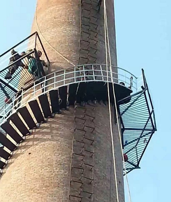 2、對100米煙囪頂部平臺從下向上依次焊接安裝,將第1塊踏步板焊接在囪身后,就依第1塊板為作業(yè)平臺依次向上逐步焊接安裝。同時準(zhǔn)備兩臺焊機,一臺焊接負責(zé)焊接安裝踏步板,另一臺負責(zé)焊接欄桿及加固用。